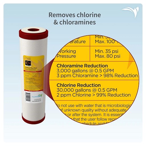 CHLORAMINE & CHLORINE – In addition to removing chloramines, the Carbon Plus cartridge is rated to treat 30,000 gallons of water @ 0.5 GPM flow rate, 2 ppm chlorine. Using a cartridge that removes both chloramines and chlorine ensures proper water conditioning.