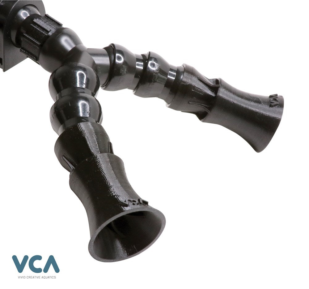 Vivid Creative Aquatics revolutionary design uses a set of 5 fins in a spiraling design that channels the water in from one direction at the base of the eductor and then out of the nozzle a different direction. The small amount of interference at the base of the eductor helps create a random change in the intake affecting the flows path exiting the nozzle