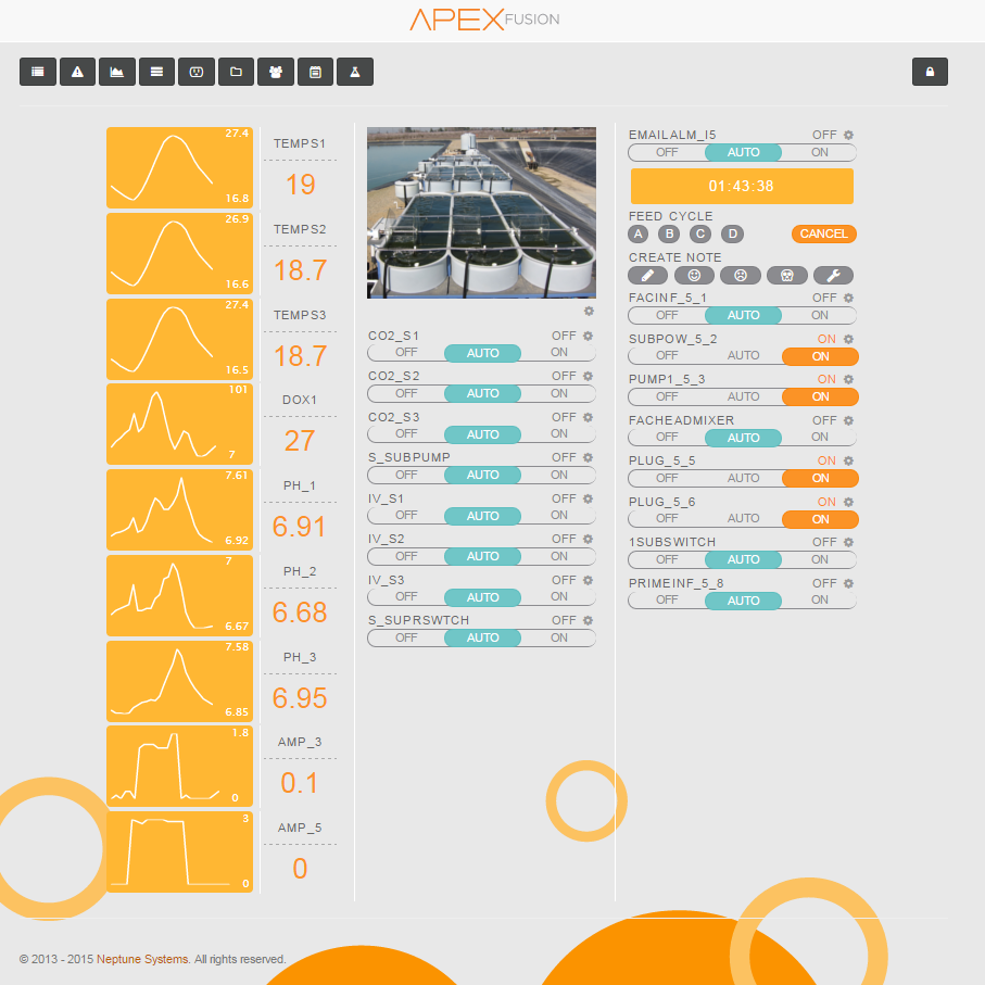 Neptune APEXFusion is an automated control and data logging system built for the cloud. The web based interface allows you to operate and monitor your raceways, aquatic systems via your Phone, Tablet, or Laptop anywhere anytime.