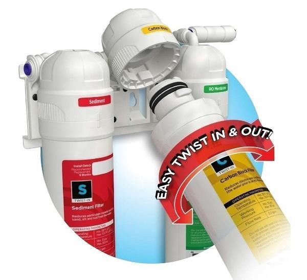 STAGE 2 – TWIST-IN CARBON BLOCK FILTER CARTRIDGE. Aquatic Life Twist-In Carbon Block Filter Cartridge: Recommend replacing every 6 months. Reduces chlorine and conditions water prior to an RO membrane. Working Pressure: Minimum 40 PSI, Maximum 80 PSI, Ideal 65 PSI.