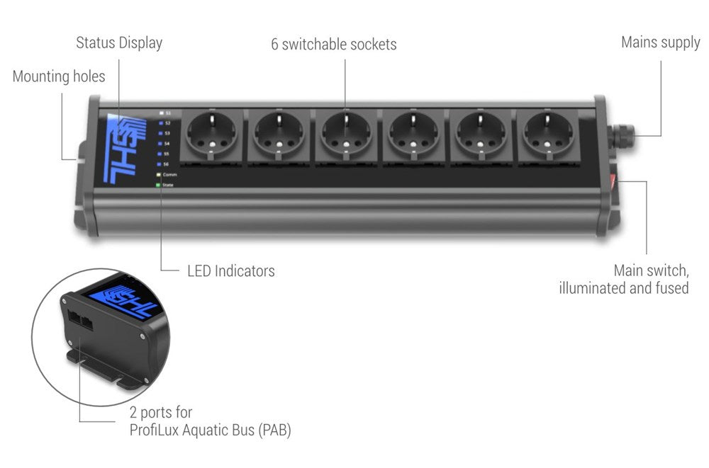 The ProfiLux Aquatic Bus enables secure and reliable communication with ProfiLux. An illuminated fused switch together with LED indicators provide you with the complete package and utmost level of safety.